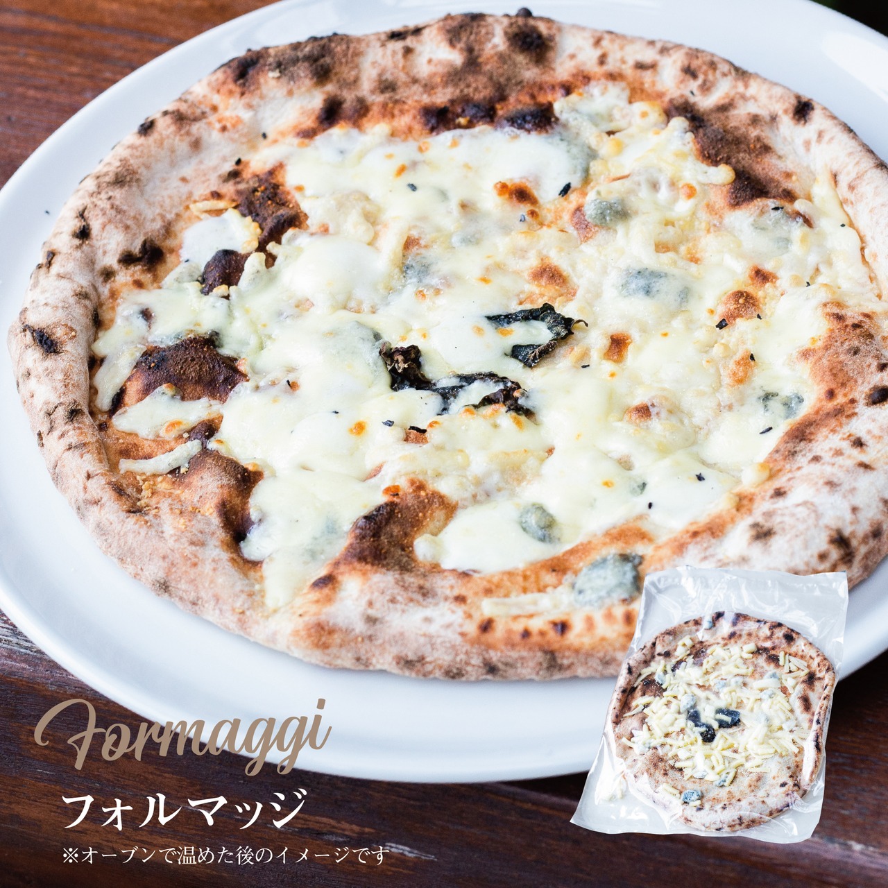◦名称:フォルマッジ ◦原材料名:モッツァレラチーズ・シュレットチーズ・バジリコ・小麦粉(国産)・ゴルゴンゾーラ・パルメザンチーズパウダー・塩・イースト ◦内容量:約200g(直径約23cm)※1 ◦賞味期限:本紙表面に記載 ◦保存方法 : マイナス18℃以下で保存して下さい ◦凍結前加熱の有無:加熱してあります ◦加熱調理の必要性:加熱してお召し上がり下さい