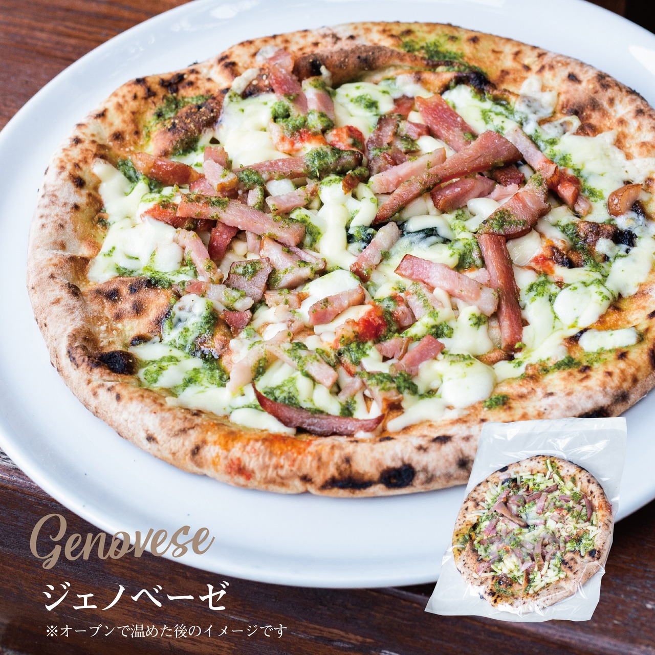 ◦名称:ジェノベーゼ ◦原材料名:モッツァレラチーズ・トマトソース・シュレットチーズ・バジリコ・小麦粉(国産)パルメザンチーズパウダー・トマトソース・ベーコン・塩・イースト・バジルペースト・オリーブオイル ◦内容量:約220g(直径約23cm)※1 ◦賞味期限:本紙表面に記載 ◦保存方法 : マイナス18℃以下で保存してください ◦凍結前加熱の有無:加熱してあります ◦加熱調理の必要性:加熱してお召し上がり下さい